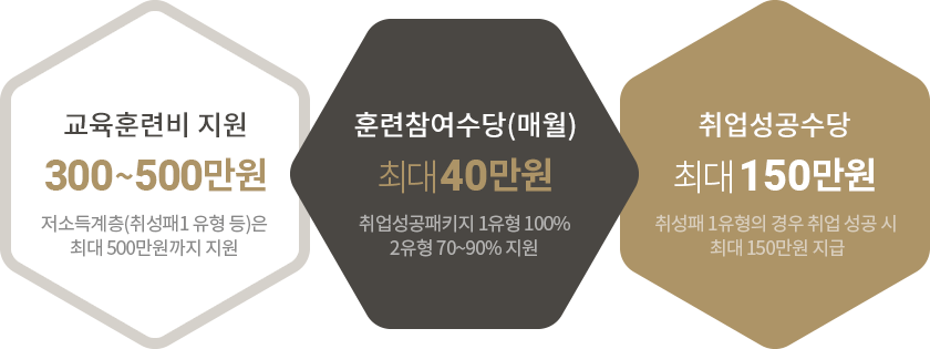 * 실업자,저소득 재직자(근로장려금 수급자)는 140시간 이상 훈련 참여 시 월 최대 116,000원의 훈련장려금 지급국민내일배움카드 지원내용 지원대상 훈련비 지원율 국민내일배움카드 소지자 최대 300만원 한도로 훈련비 45~85% 지원 취업성공패키지 1유형 최대 500만원 한도로 훈련비 50~85% 지원 취업성공패키지 2유형 최대 300만원 한도로 훈련비 80~100% 지원